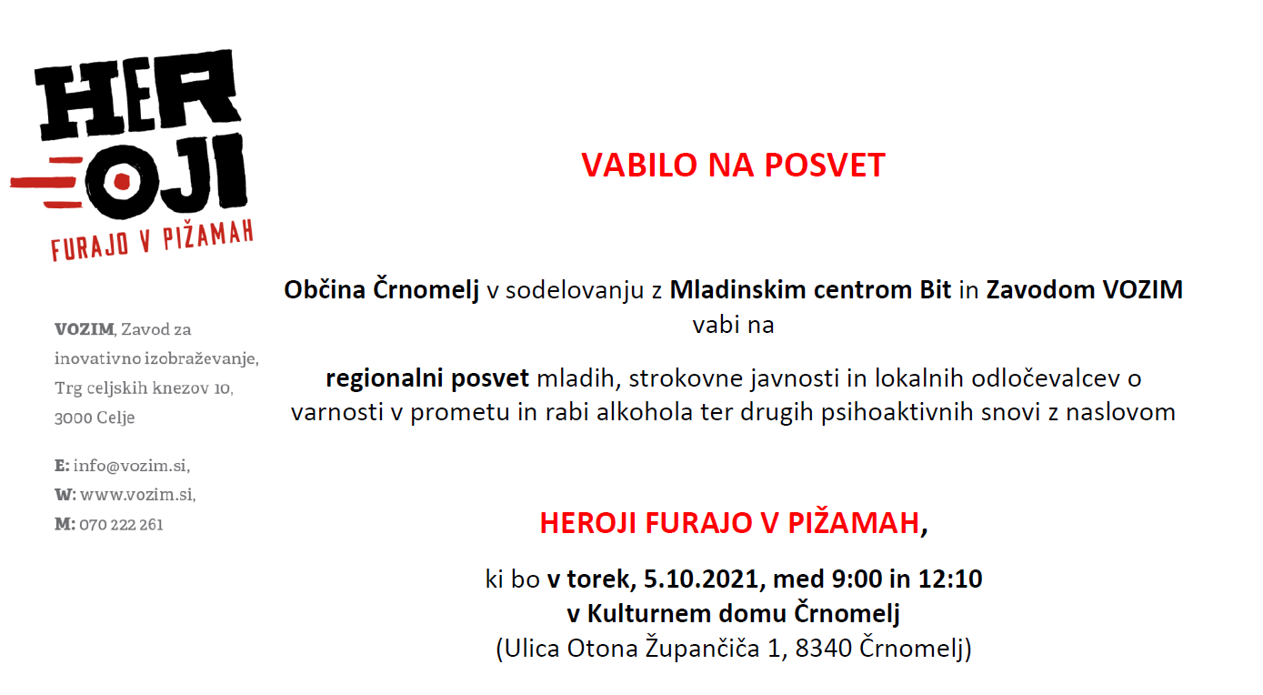 Posvet o rabi alkohola in drugih psihoaktivnih snovi ter prometni varnosti med mladimi je namenjen predstavitvi projekta Heroji furajo v pižamah, prvenstveno pa predstavitvi težav in izzivov, s katerimi se soočajo mladi na področju škodljive rabe alkohola in drugih psihoaktivnih snovi ter udejstvovanja v prometu. Rezultati posveta bodo predlogi konkretnih izboljšav in rešitev, ki jih bodo predstavili mladi, z namenom aktivacije in implementacije v občini Črnomelj in okoliških občinah.