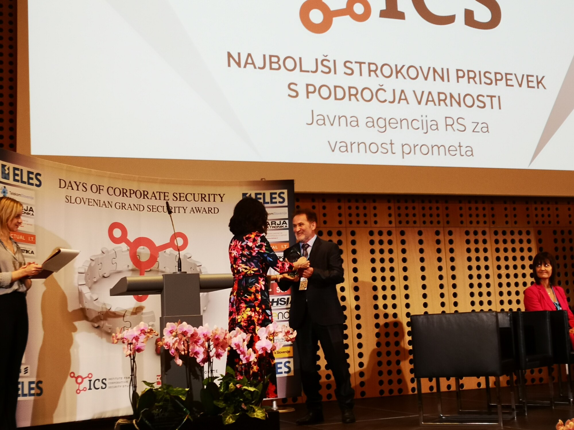 (Brdo pri Kranju, 31. maj 2022) Direktor Javne agencije RS za varnost prometa Jože Hribar je danes v kongresnem centru na Brdu pri Kranju prejel prestižno nagrado »Slovenian Grad Security Award 2022« v kategoriji »Najboljši strokovni prispevek s področja varnosti« za leto 2021. Neodvisna komisija je preventivne akcije »Uporaba mobilnega telefona, Hitrost in Varnostni pas« izbrala za nagrado, ki je bila podeljena na svečanosti v okviru mednarodne konference “Dnevi korporativne varnosti 2022”. Agencija za varnost prometa v akcijah izkazuje inovativne pristope in interaktivno podaja vsebine širokemu krogu javnosti, je bilo še izpostavljeno v obrazložitvi. Podelitvi je sledila še okrogla miza, ki jo je vodil predsednik organizacijskega odbora izr. prof. dr. Denis Čaleta.