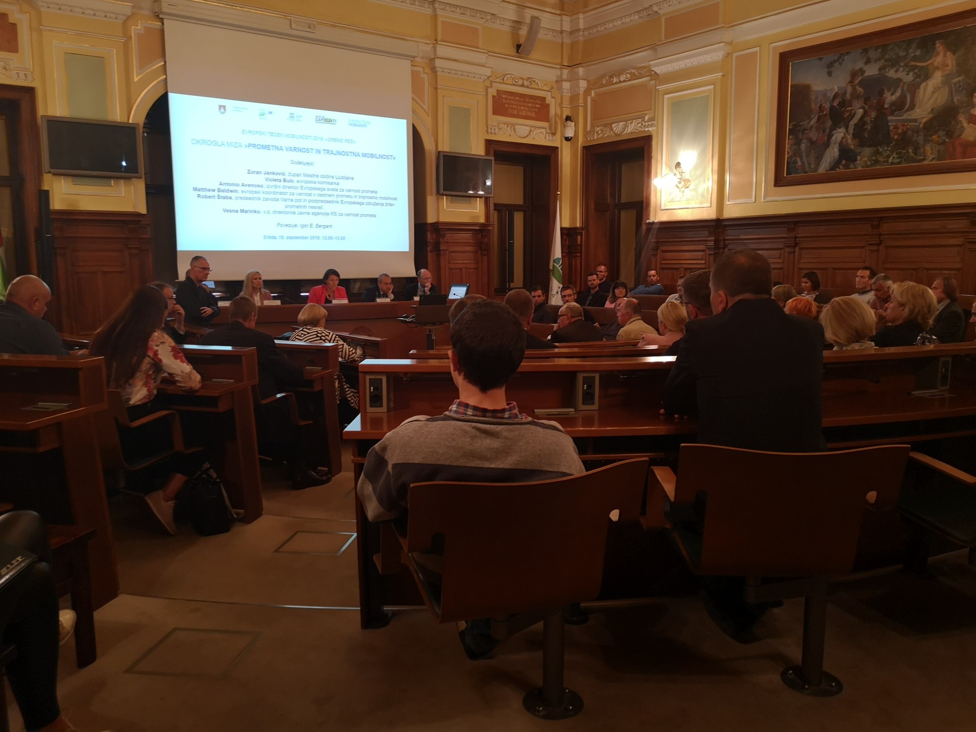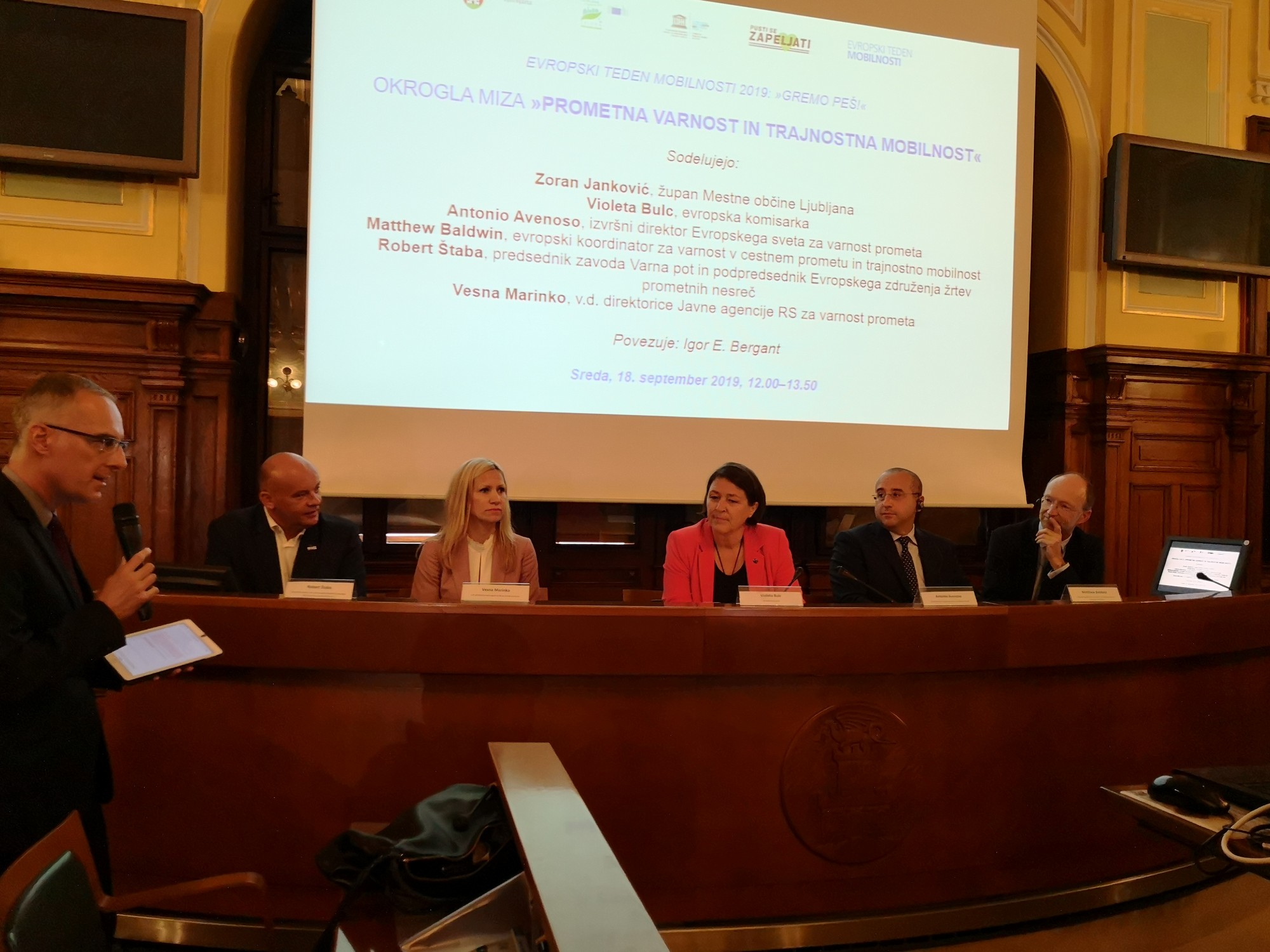 (Ljubljana, 18. september 2019) V Mestni hiši v Ljubljani je v okviru Evropskega tedna mobilnosti potekala okrogla miza z naslovom Prometna varnost in trajnostna mobilnost, na kateri je aktivno sodelovala v. d. direktorice Javne agencije RS za varnost prometa Vesna Marinko. Sogovorniki na okrogli mizi so bili evropska komisarka za promet Violeta Bulc, izvršni direktor Evropskega sveta za varnost prometa Antonio Avenoso, evropski koordinator za varnost v cestnem prometu in trajnostno mobilnost Matthew Baldwin, ljubljanski župan Zoran Janković in predsednik zavoda Varna pot Robert Štaba. Strokovno okroglo mizo je vodil Igor E. Bergant.