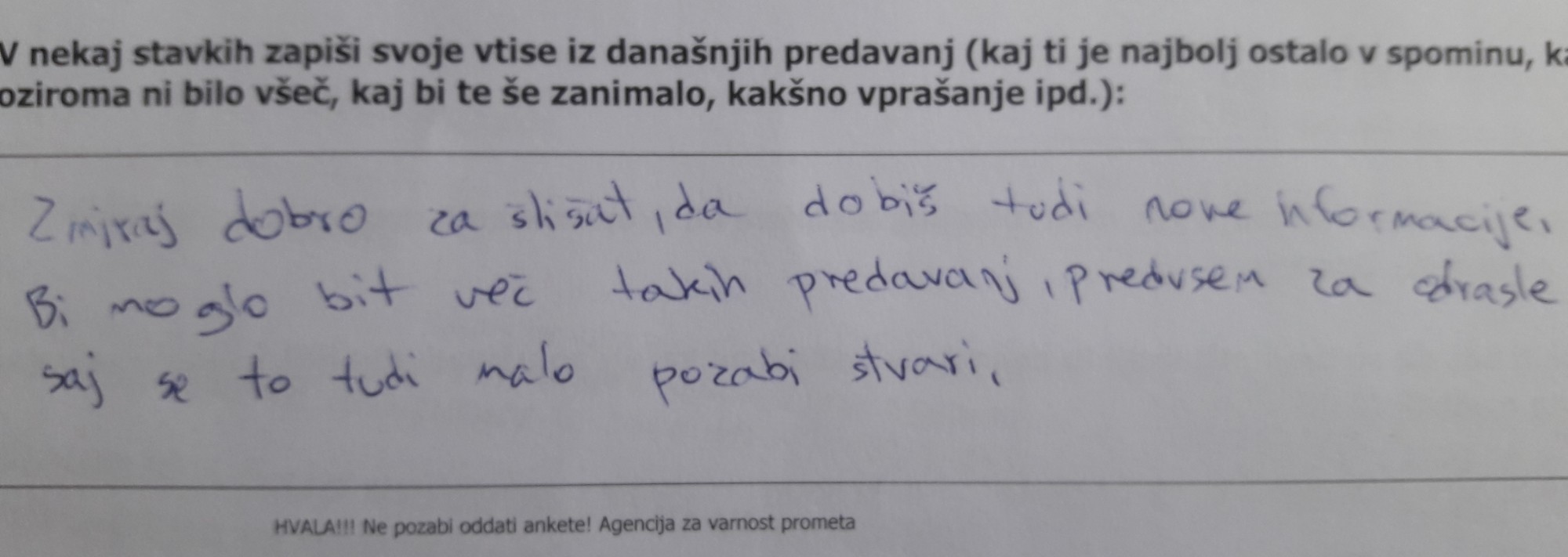 Dijaki so ob koncu delavnic reševali tudi anketne vprašalnike, kjer smo dobili pozitivna mnenja in pohvalne komentarje. Mladim se takšne vsebine o prometni varnosti zdijo zelo koristne in poučne, po njihovem mnenju bi morali predavanja slišati večkrat. Izvedeli so več o tem, kako ravnamo v prometu ob izrednih dogodkih, kaj storiti v primeru požara ali prometne nesreče, kako pomagati udeležencem itd.