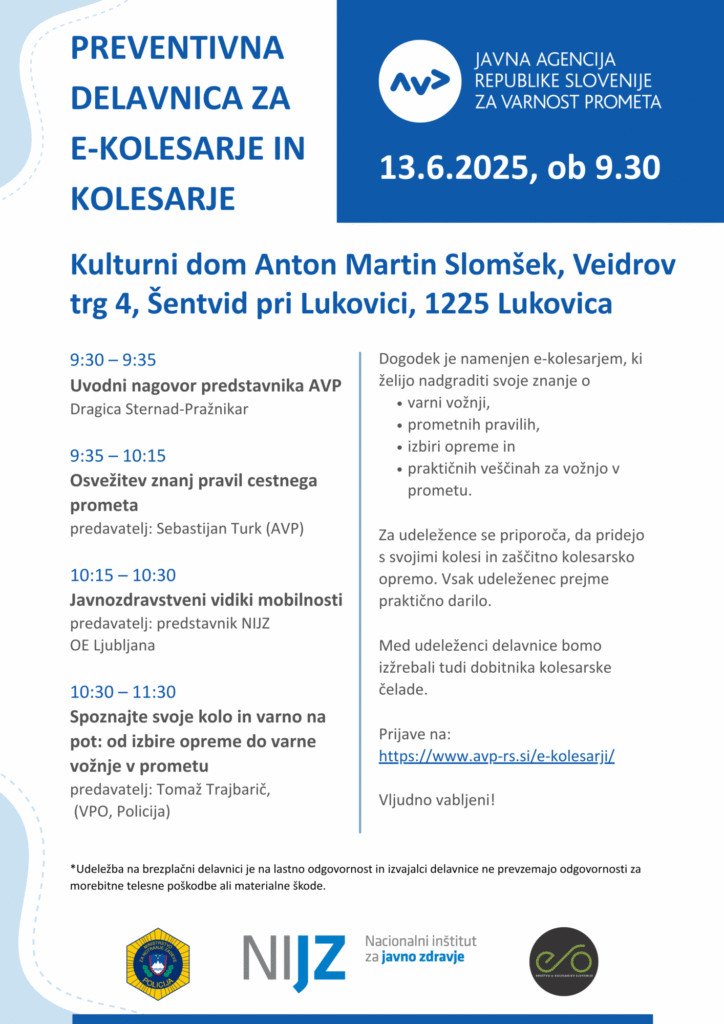 V petek, 13. junija 2025 ob 9.30, bo v Kulturnem domu Anton Martin Slomšek v Lukovici potekala brezplačna preventivna delavnica za e-kolesarje in kolesarje, ki jo organizira Agencija za varnost prometa v sodelovanju s partnerji.