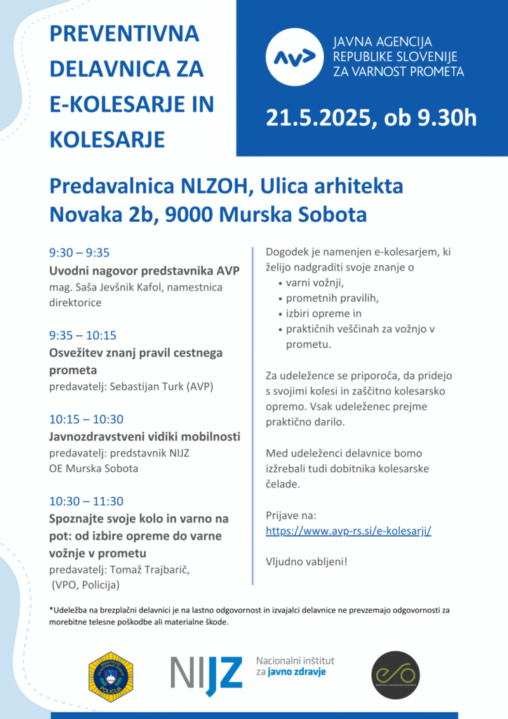 Javna agencija RS za varnost prometa v sodelovanju z Nacionalnim inštitutom za javno zdravje (NIJZ) ter Policijo organizira brezplačno preventivno delavnico za kolesarje in uporabnike e-koles.
