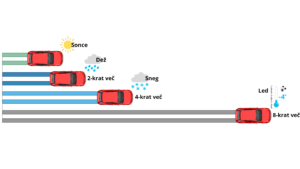 - Tehnika zaviranja na mokrem, zasneženem ali poledenelem cestišču naj bo prilagojena razmeram. Nenadno zaviranje in zavijanje povzroči, da lahko pnevmatike izgubijo že tako slab oprijem na cesti, s tem pa lahko vozilo zdrsi. Na zasneženem in poledenelem vozišču se je težje ustaviti v sili, prav tako se lahko pot ustavljanja podaljša (prikaz na spodnji sliki).