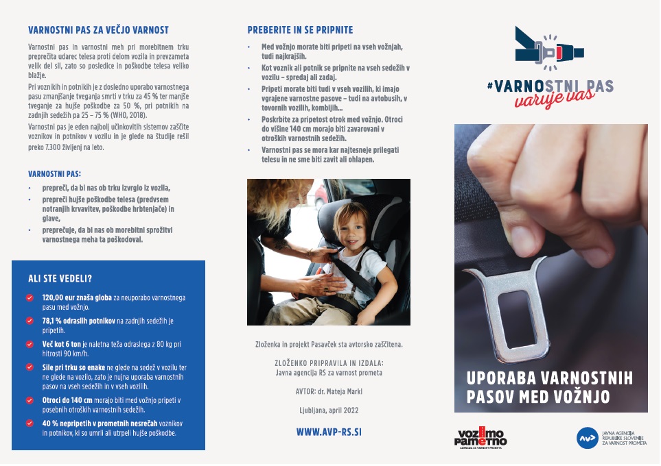 (Ljubljana, 4. april 2022) Danes se pričenja nacionalna preventivna akcija Varnostni pas varuje vas, ki bo trajala do 10. aprila 2022, vodi pa jo Agencija za varnost prometa v sodelovanju s Policijo. Akcija je namenjena opozarjanju na pomembnost pripetosti z varnostnim pasom vseh potnikov v vozilu na vsaki, tudi najkrajši poti ter povečanju deleža pripetosti z varnostnim pasom. V prvih treh mesecih letošnjega leta je Policija po začasnih podatkih ugotovila že 12.460 kršitev neuporabe varnostnih pasov. Posebej zaskrbljujoče pa je, da je v tem času Policija ugotovila kar 1.265 kršitev, povezanih z neuporabo zadrževalnih sistemov pri otrocih. Otroci so najbolj izpostavljeni in že ob lažjih trkih lahko utrpijo hujše posledice, zato je odgovornost vsakega odraslega, da poskrbi za njihovo pripenjanje in varen prevoz! Stopnja uporabe varnostnega pasu v letu 2021 je pri umrlih voznikih osebnih avtomobilov znašala 56 % oz. najmanj v zadnjem 5 letnem obdobju. Od 32 umrlih voznikov osebnih avtomobilov, jih je 18 uporabljalo varnostni pas. Delež neuporabe varnostnega pasu je znašal kar 41 %. Zaradi premajhnega zavedanja voznikov o nujnosti uporabe varnostnega pasu bo Agencija za varnost prometa letos julija izvedla dodatno preventivno akcijo. Vsaka policijska uprava bo v času nacionalne preventivne akcije izvedla po en poostren nadzor nad uporabo varnostnih pasov, sicer pa bodo policisti aktivnosti v zvezi z akcijo izvajali ob rednem delu.