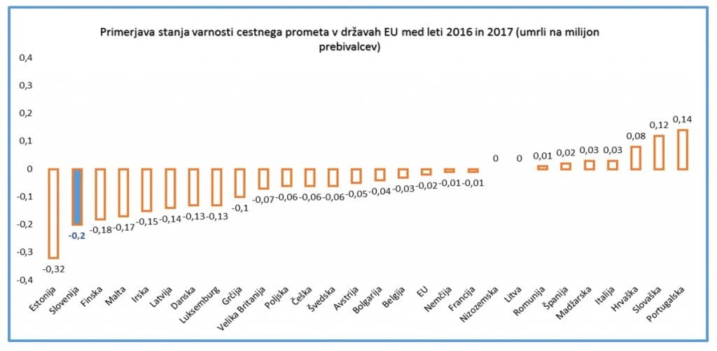 Slovenija je skupaj z Estonijo dosegla izjemen uspeh na področju varnosti cestnega prometa v primerjavi z letom 2016. Estonija je kot najbolj uspešna dosegla 32 % zmanjšanje števila smrtnih žrtev v prometnih nesrečah, Slovenija pa se uvršča na zavidljivo 2. mesto, saj smo uspeli zmanjšati število smrtnih žrtev kar za 20 %. Celotno poročilo je objavljeno na spletnih straneh Evropske komisije: http://europa.eu/rapid/press-release_IP-18-2761_sl.htm