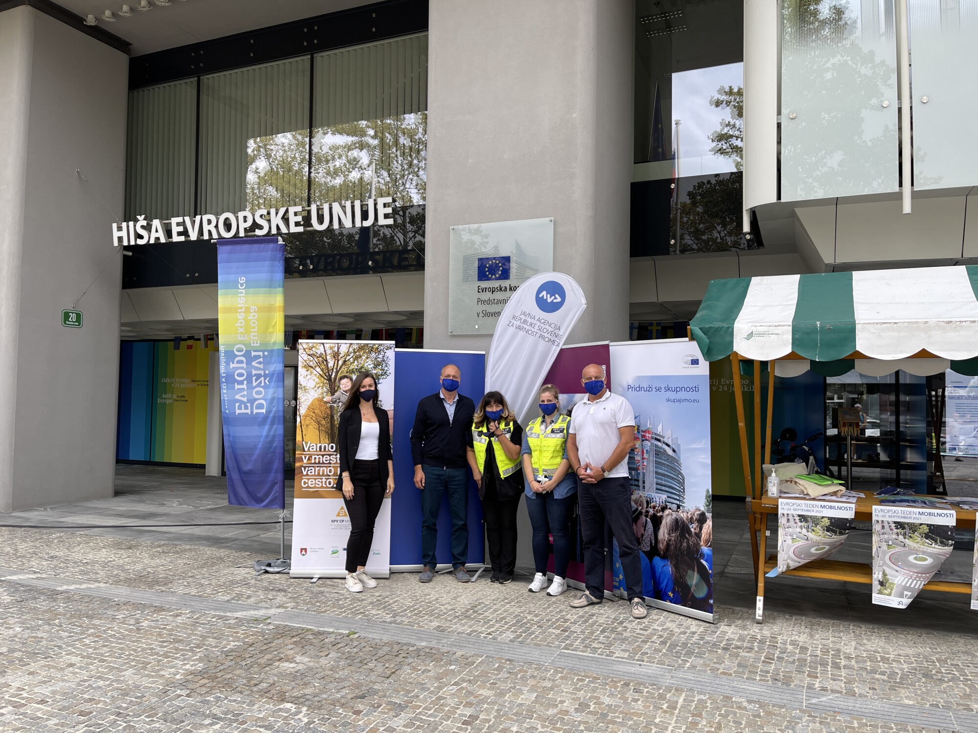 (Ljubljana, 16. september 2021) V Evropskem tednu mobilnosti je pred Hišo EU v Ljubljani obiskovalce vsak dan pozdravil vetrni plesalec #Doživko in jih popeljal po multimedijskem centru Doživi Evropo, v katerem so lahko izvedeli več o Evropski uniji in pomenu trajnostne mobilnosti. Pisarna Evropskega parlamenta v Sloveniji in Hiša EU sta skupaj z Agencijo za varnost prometa, z Mestno občino Ljubljana, Svetom za preventivo in vzgojo v cestnem prometu ter ostalimi deležniki ob začetku Evropskega tedna mobilnosti za najmlajše pripravili spretnostni poligon, obiskovalci so lahko zavrteli kolo sreče in si prislužili praktične preventivne nagrade.