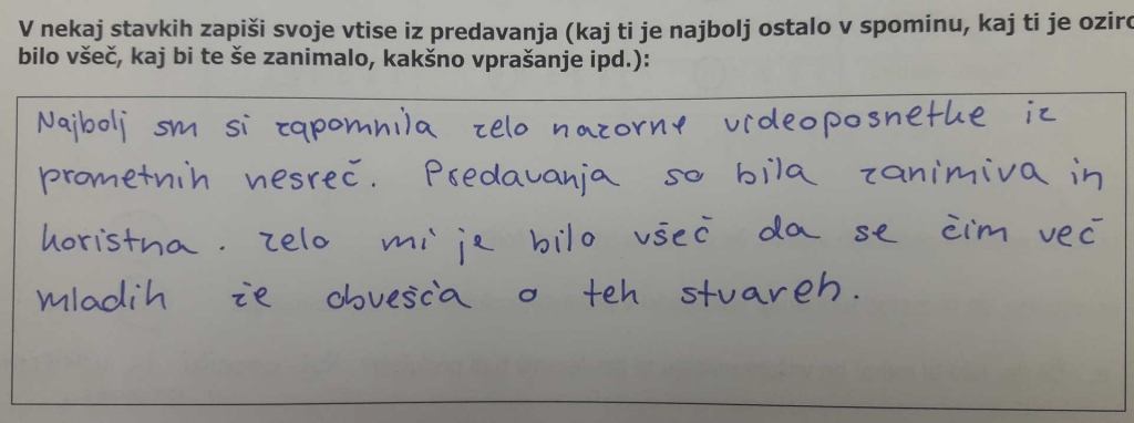 Za dijake 3. letnikov gimnazijskega programa smo pripravili 4-urne delavnice, kjer so preko predavanj, videogradiv in praktičnega prikaza lahko izvedeli veliko koristnih informacij za varnejšo udeležbo v prometu. Poslušali so predavanje policista o posledicah prometnih nesreč ter predavanje invalida, ki jim je predstavil svojo zgodbo o prometni nesreči. Nato pa so se poučili kako nuditi prvo pomoč poškodovancem, nazadnje pa so lahko preizkusili tudi praktične naprave (za prikaz naletne teže, pijana očala za prikaz alkoholiziranosti, za prikaz reakcijskega časa v različnih okoliščinah in šotor Vidko – za prikaz vidnosti pešcev z odsevnimi telesi oz. neopaznosti tistih, ki odsevnih teles ne uporabljajo). Delavnic se je udeležilo 48 dijakov.