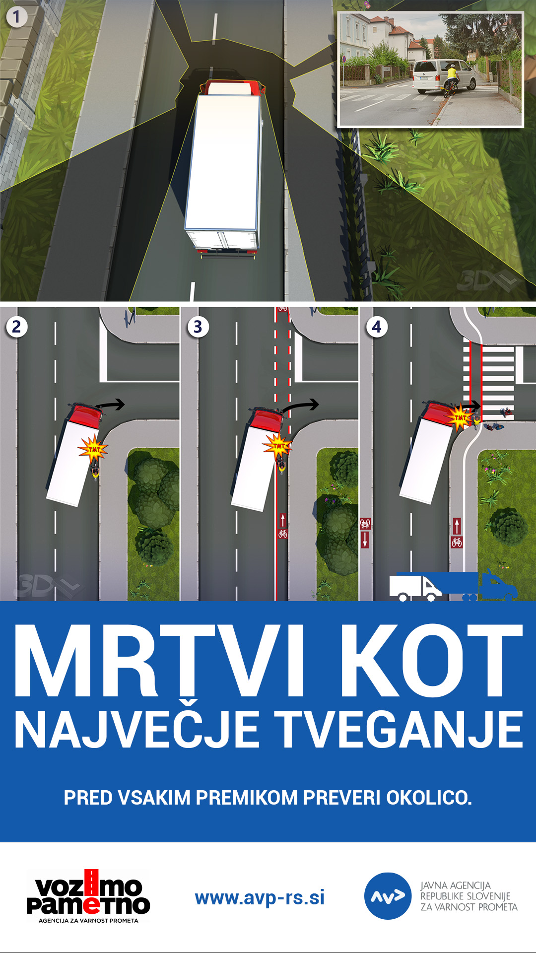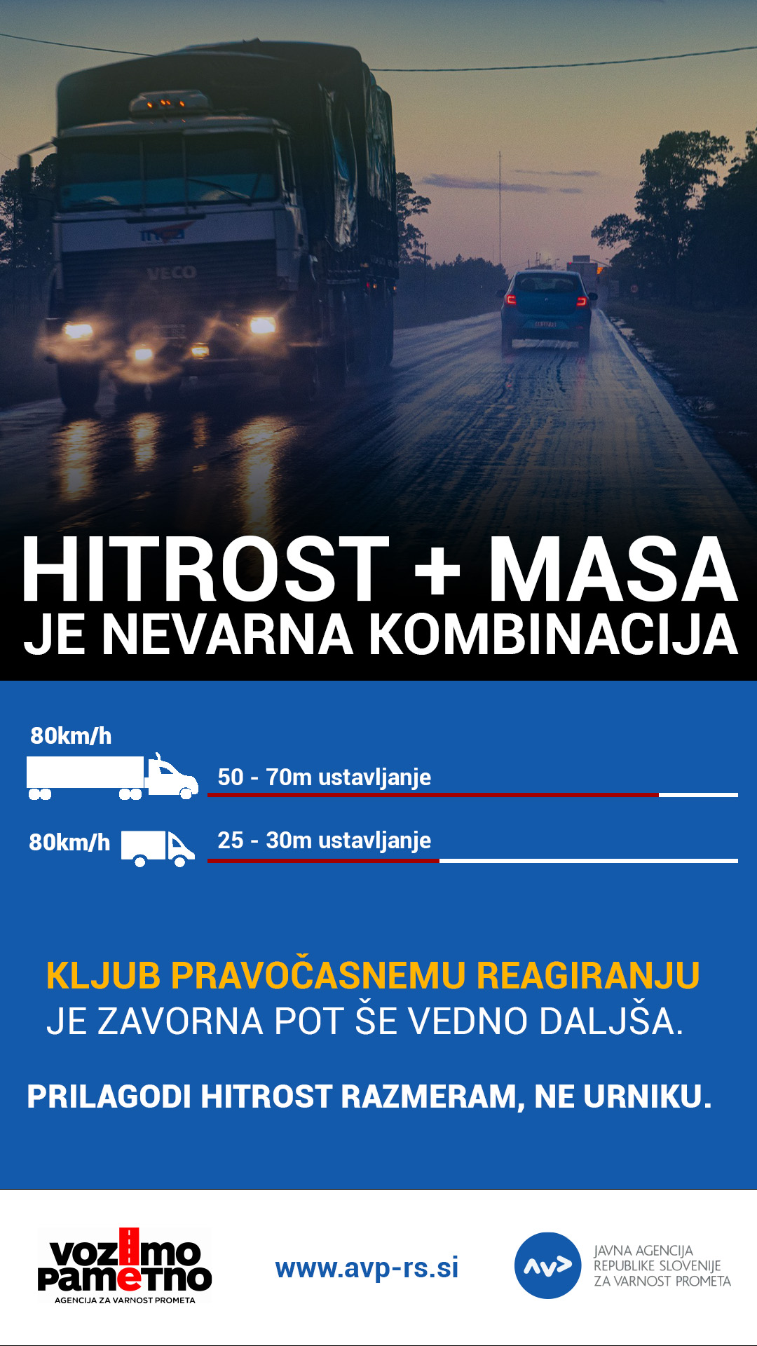 AVP v času akcije poudarja pomen odgovornega ravnanja vseh udeležencev v prometu – tako poklicnih voznikov kot voznikov osebnih vozil in potnikov v avtobusih. S spoštovanjem pravil, večjo strpnostjo in zavedanjem omejitev težkih vozil lahko skupaj pomembno prispevamo k večji prometni varnosti.