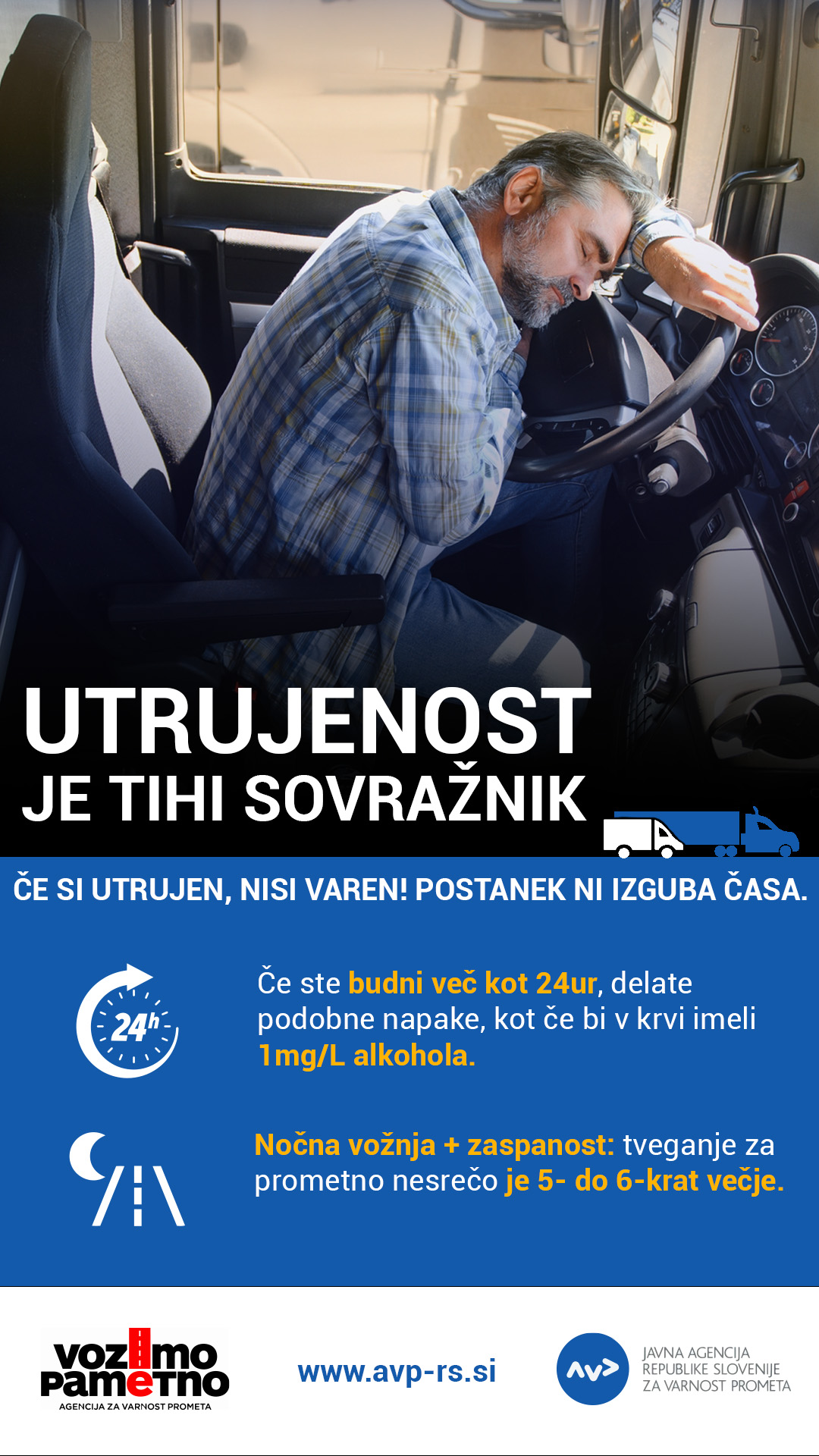 (Ljubljana, 6. februar 2026) Od ponedeljka, 9. februarja, do nedelje, 15. februarja 2026, bo potekala druga letošnja nacionalna preventivna akcija z naslovom Poklicni vozniki – ozaveščanje za večjo varnost voznikov tovornih vozil in avtobusov. Akcijo izvajata Agencija za varnost prometa (AVP) in Policija. V istem obdobju bo potekal tudi evropsko usklajen poostren nadzor Truck & Bus.