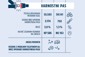 (Ljubljana, 21. oktober 2021) Kakšno je stanje uporabe mobilnih telefonov in kakšna je stopnja pripetosti pri voznikih motornih vozil je na vpadnicah v vseh 11 mestnih občinah z opazovanjem na terenu preverjala Agencija za varnost prometa. Prvo opazovanje je izvedla konec januarja letos in ga ponovila konec avgusta. Mobilni telefon je avgusta uporabljalo 1.162 voznikov oziroma 2 % od vseh vozil (59.141), ki so bila v štirih urah zajeta v štetje, februarja pa 1.482 oziroma 2,7 % od vseh vozil (55.503). Z varnostnim pasom avgusta ni bilo pripetih 750 voznikov oziroma 1,3 %, februarja pa 2.174 voznikov oziroma 3,9 %. Ob sicer večjem obsegu prometa so v jutranjem in popoldanskem intervalu avgusta tako zabeležili manj voznikov, ki so med vožnjo uporabljali mobilni telefon in več voznikov, ki so bili med vožnjo pripeti z varnostnim pasom. Opazovanje so opravili 15 dni po uveljavitvi novele Zakona o pravilih cestnega prometa, ki je uvedla strožje kazni za uporabo mobilnega telefona med vožnjo. Pred začetkom jesenskih šolskih počitnic Agencija za varnost prometa voznike motornih vozil znova naproša, naj poskrbijo za pripetost vseh potnikov v vozilu in dosledno uporabo otroških zadrževalnih sistemov. Uporaba varnostnega pasu je predpisan in nujni sestavni del varne vožnje. Dokazano rešuje življenja. Z močjo rok in nog bi se lahko zadržali v sedežu le pri trku s hitrostjo do 7 km/h. Odpovedo naj se uporabi mobilnega telefona, ki je že vrsto let eden izmed večjih motilcev pozornosti v prometu. Če voznik na cesto ne gleda le 5 sekund, pri hitrosti 60 km/h »na slepo« prevozi razdaljo več kot 83 metrov. Vozniki ob uporabi mobilnega telefona tudi pogosto povzročajo zastoje v prometu.