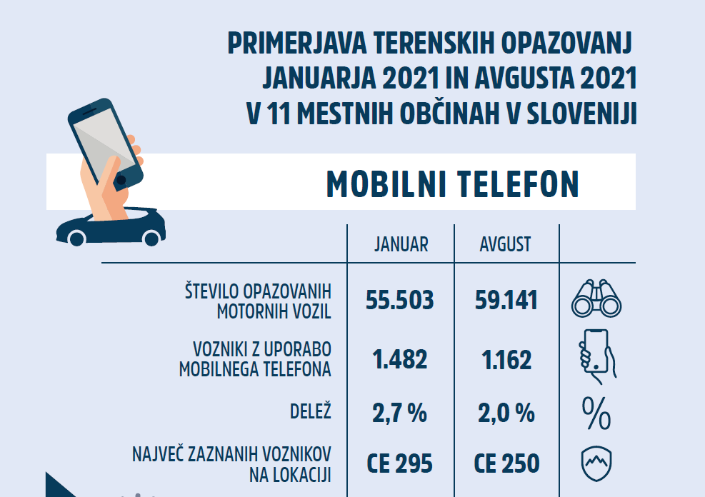 Prvo štetje uporabe mobilnih telefonov pri voznikih motornih vozil in pripetosti voznikov z varnostnim pasom je bilo opravljeno 27. januarja 2021, v času, ko je po celotni Sloveniji potekala nacionalna preventivna akcija za ozaveščanje o tveganjih uporabe in poostren nadzor policije glede uporabe naprav in opreme, ki ovirajo voznike med vožnjo. Drugo štetje je potekalo 26. avgusta 2021. Štetji sta bili izvedeni v dveh enakih intervalih, v jutranji (med 7. in 9. uro) in popoldanski prometni konici (med 15.in 17. uro). Izbor mikrolokacij je bil določen glede na povprečni letni dnevni promet iz leta 2019. Mikrolokacije so bile v obeh štetjih iste, vpadnice v vseh 11 mestnih občin. V času prvega štetja je šlo za čas, ko je bila gostota prometa na mestnih vpadnicah zaradi ukrepov za zajezitev epidemije nekoliko manjša. A kljub temu je v štirih urah na enajstih lokacijah kar 1.482 voznikov (2,7 %) med vožnjo uporabljalo mobilni telefon in s tem tvegalo nastanek prometne nesreče. Drugo štetje je potekalo 15 dni po uveljavitvi novele Zakona o pravilih cestnega prometa, ki je uvedla strožje kazni za uporabo mobilnega telefona med vožnjo. Kljub večjemu obsegu prometa je bilo zaznanih manj voznikov, 1.162 (2 %), ki so med vožnjo telefonirali. Agencija za varnost pometa opozarja, da vsaka uporaba telefona pomembno zmanjšuje pozornost voznika. Tuje raziskave kažejo, da je med pisanjem SMS sporočila ali pregledovanjem družbenih omrežij voznik povprečno 5 sekund osredotočen na telefon in ne na vožnjo. Pri hitrosti 60 km/h prevozi razdaljo več kot 83 metrov. V naselju, pri vožnji s 50 km/h prevozi skoraj 70 metrov. Še večje tveganje pa je na avtocestah, kjer pri hitrosti 130 km/h v petih sekundah prevozi več kot 180 metrov, na hitri cesti pri vožnji 100 km/h pa prevozi 139 metrov. Gre za podobno tveganje, kot da bi takšno razdaljo prevozil z zaprtimi očmi. Voznik vozi z bistveno zmanjšano pozornostjo in s tem ogroža sebe in vse druge udeležence prometa.