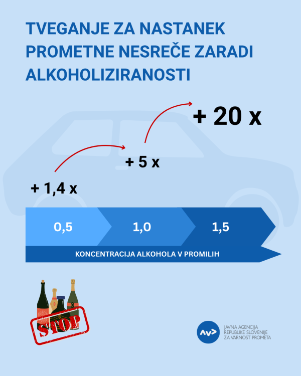 - Že pri koncentraciji 0,5 promila alkohola se verjetnost povzročitve prometne nesreče poveča za 1,4-krat, pri 1,0 promila pa 5-krat v primerjavi s treznim voznikom. Pri 1,5 promila se tveganje za nastanek prometne nesreče poveča za kar 20-krat! (Vir: ERSO)