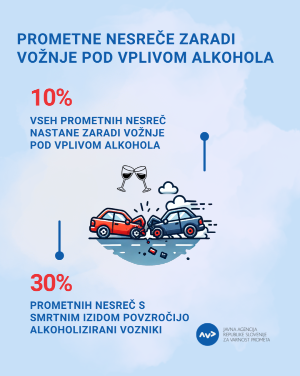 Slovenijo žal še vedno zaznamujeta t. i. »mokra kultura«, visoka toleranca do uživanja alkohola in lahka dostopnost, tudi za mladoletne. Po podatkih NIJZ je v letu 2024 registrirana poraba alkohola znašala 10 litrov čistega alkohola na prebivalca, starega 15 let in več. To pomeni, da se je v primerjavi s predhodnim letom poraba zvišala za 0,7 litra (oziroma več kot 7 %). Ampak alkohol v prometu naj ne bo del tradicije! Številke govorijo zase. Alkohol je eden od glavnih dejavnikov za prometne nesreče, saj je po podatkih Policije za okrog 10 % vseh prometnih nesreč pri nas vzrok vožnja pod vplivom alkohola oziroma so alkoholizirani vozniki krivi za skoraj 30 % nesreč s smrtnim izidom. Do 7. novembra 2025 je bilo zabeleženih 1231 prometnih nesreč, kjer so bili povzročitelji pod vplivom alkohola. V teh nesrečah je umrlo 22 ljudi, 112 jih je utrpelo hude telesne poškodbe, 478 pa lažje poškodbe (lani ob istem času 1311 nesreč, 17 smrtnih žrtev, 121 hudo telesno poškodovanih in 557 z lažjimi poškodbami). Lani v celem letu so povzročitelji pod vplivom alkohola povzročili 1537 prometnih nesreč, v katerih je umrlo 17 ljudi, 135 je bilo huje, 633 pa lažje poškodovanih. Zakonska meja pri nas je 0,50 promila – gramov alkohola na kilogram krvi, kar pa ne pomeni varne meje za udeležbo v prometu! Najpogostejši povzročitelji prometnih nesreč pod vplivom alkohola pri nas so v starostnih skupinah 25-34, 35-44 in 45-54 let. Zaskrbljujoče je, da smo v letu 2025 imeli enega povzročitelja prometne nesreče pod vplivom alkohola, ki je bil mlajši od 15 let, 13 nesreč pa so povzročili mladostniki, stari od 15 do 17 let. Po regijah glede deleža alkoholiziranih povzročiteljev prometnih nesreč v letošnjem letu prevladujejo Posavska, Pomurska regija ter Jugovzhodna Slovenija (Vir: NIJZ, 2025).