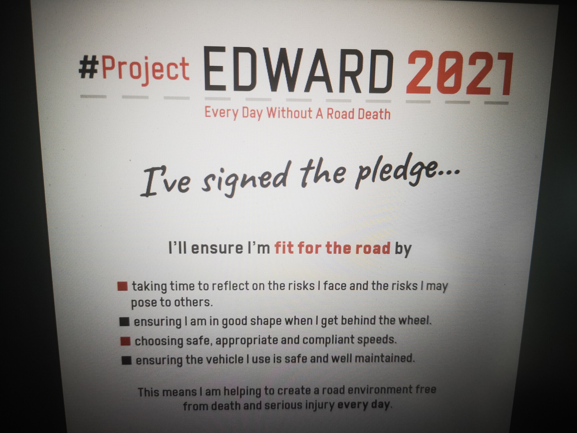 Vse udeležence v prometu vabimo, da se s podpisom prisege EDWARD za varnost na cesti pridružijo krogu ljudi, ki so se že zavezali, da bodo po svojih najboljših močeh prispevali k boljši prometni varnosti. S podpisom prisege EDWARD za varnost na cesti se lahko zavežejo, da bodo z odgovornim ravnanjem in strpno vožnjo tudi sami prispevali k boljši prometni varnosti.