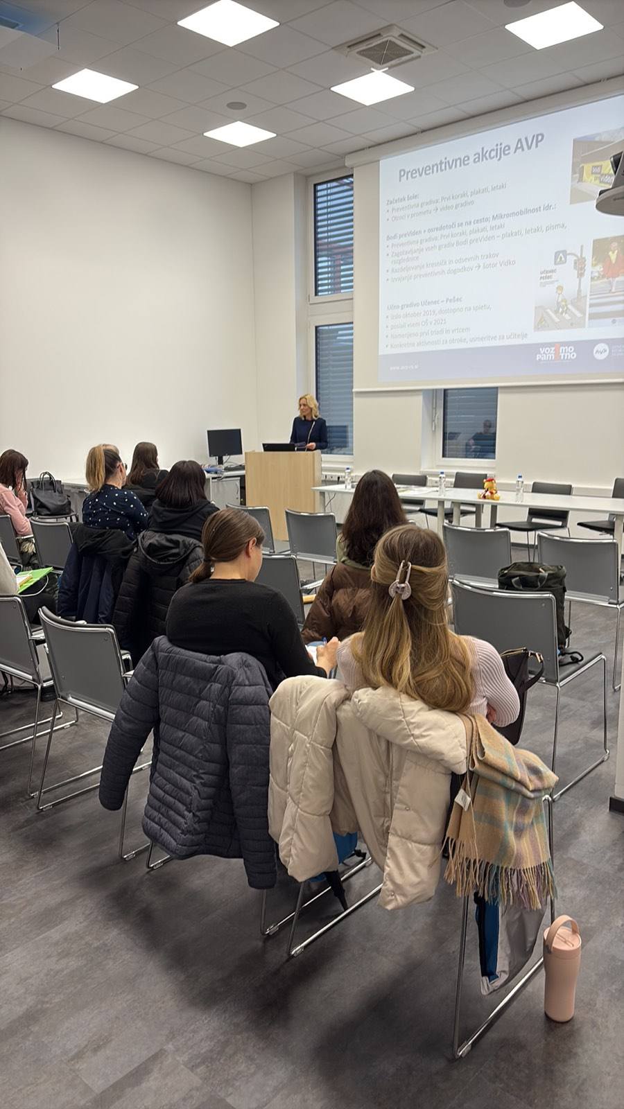 Udeležence usposabljanja je nagovorila vodja sektorja za razvoj, preventivo in vzgojo v cestnem prometu Agencije za varnost prometa dr. Saša Kuhar, ki je poudarila ključno vlogo vzgojiteljev in učiteljev pri oblikovanju odgovornih in varnih udeležencev v prometu. Dr. Irena Janžekovič Žmauc je predstavila delo in prometnovarnostne programe Agencije za varnost prometa, aktualne podatke o varnosti otrok v prometu, pravilno uporabo otroških varnostnih sedežev ter učna gradiva, ki jih AVP nudi vrtcem in šolam.