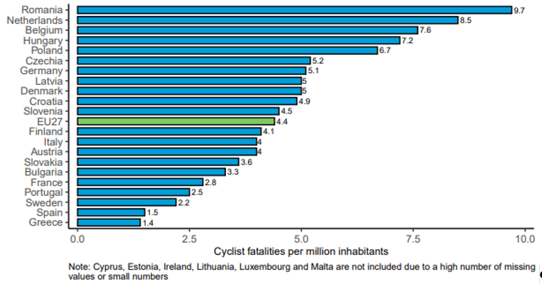 Na podlagi podatkov Evropske komisije, se Slovenija uvršča v povprečje EU, saj je v obdobju 2017 – 2019 povprečno na milijon prebivalcev umrlo statistično 4,5 kolesarja. Upoštevati pa je potrebno tudi dejstvo, da v določenih državah bolj uporabljajo kolo kot v drugih. Tako npr. na Nizozemskem polovica prebivalcev kolesari 1x tedensko, v Sloveniji več kot 13 % vsaj štirikrat tedensko, v Španiji in Grčiji pa manj kot 9 %.