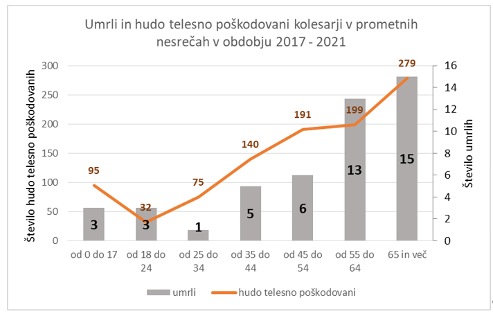 Med smrtnimi žrtvami je bila na ravni EU skoraj polovica (47 %) smrtnih žrtev starih 65 let ali več, 82 % smrtnih žrtev je bilo moških. Tudi v Sloveniji je trend podoben, saj je v obdobju 2017-2021 največ kolesarjev umrlo v starostni skupini nad 65 let (15 umrlih) ter v starostni skupini med 55. in 64. letom starosti (13 umrlih), kar prikazuje spodnji graf.