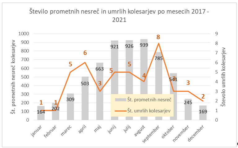 Dve tretjini (68 %) vseh smrtnih prometnih nesreč med kolesarji na ravni EU beležijo podnevi, v času delovnika. Največ nesreč se zgodi na urbanih področjih, najbolj kritična so križišča. Tudi v Sloveniji se 86 % prometnih nesreč z udeležbo kolesarjev pripeti na cestah v naselju, največ med junijem in septembrom, najmanj pa med decembrom in februarjem, kot je razvidno iz spodnjega grafa. V osrednjeslovenski, gorenjski in obalno-kraški regiji je zabeleženih največ prometnih nesreč s kolesarji. To so tudi regije z večjim številom urbanih naselij in razvejano mrežo turizma.