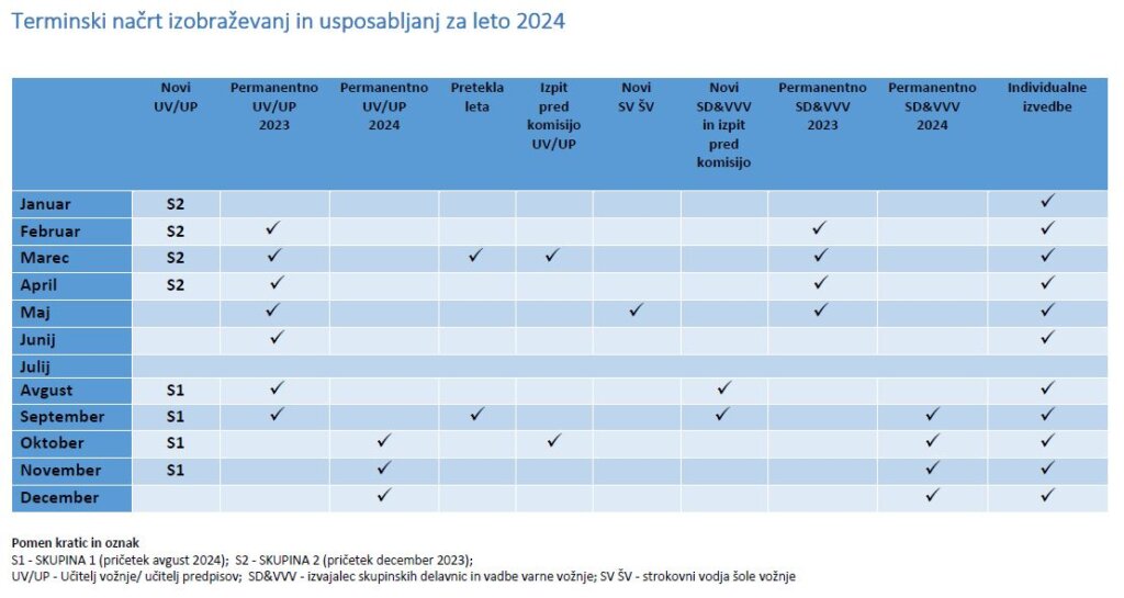 Objavljamo okvirni letni načrt izobraževanj in dodatnih usposabljanj s področja učiteljev vožnje in predpisov, strokovnih vodij šole vožnje ter izvajalcev skupinskih delavnic in vadbe varne vožnje za leto 2024.