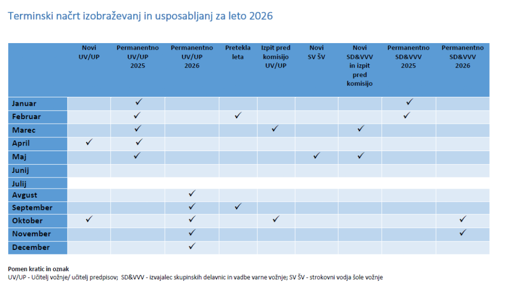 Objavljamo okvirni letni načrt izobraževanj in dodatnih usposabljanj s področja učiteljev vožnje in predpisov, strokovnih vodij šole vožnje ter izvajalcev skupinskih delavnic in vadbe varne vožnje za leto 2026.
