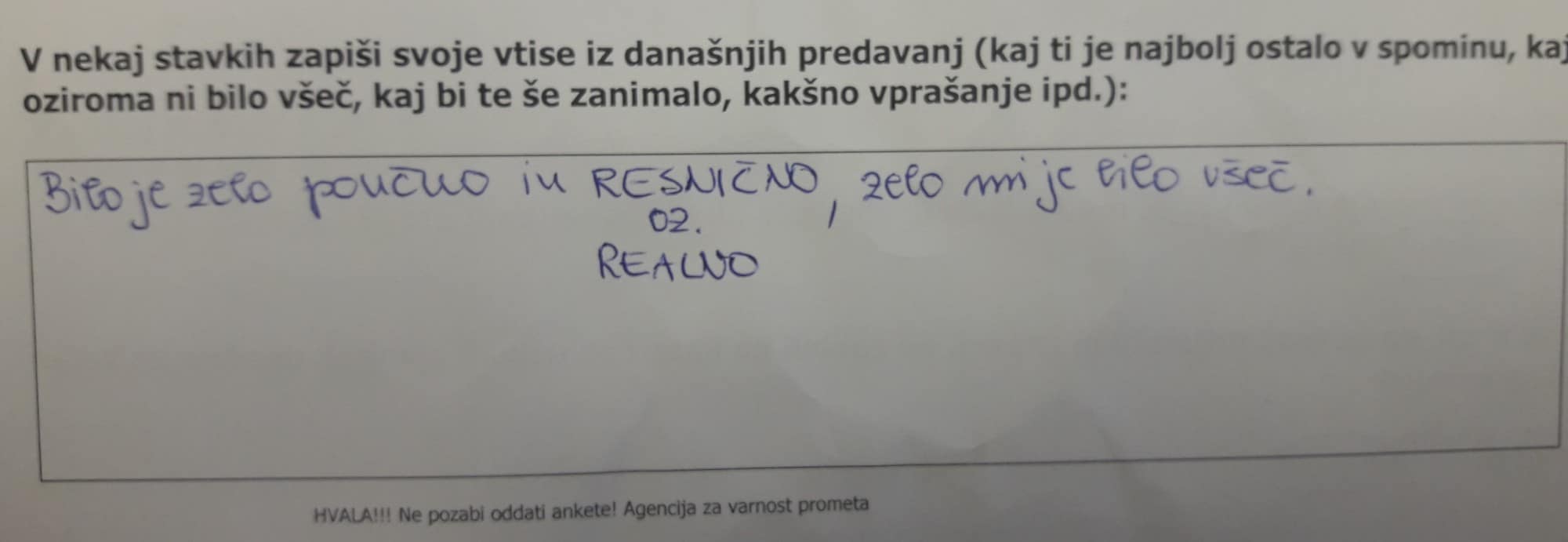 Govorili smo tudi o čustvenih in psihičnih posledicah, ki ji prometne nesreče pustijo na vseh žrtvah – poškodovanih, svojcih in drugih prisotnih na kraju nesreče. Nekaj besed je bilo namenjenih tudi ogroženosti mladih voznikov, pomanjkanju vozniških izkušenj in vožnji s spremljevalcem. Na koncu delavnic pa so dijaki ponovili tudi nudenje prve pomoči in temeljne postopke oživljanja z uporabo defibrilatorja ter tudi očala za prikaz alkoholiziranosti in vpliva drog na vidno zaznavanje.