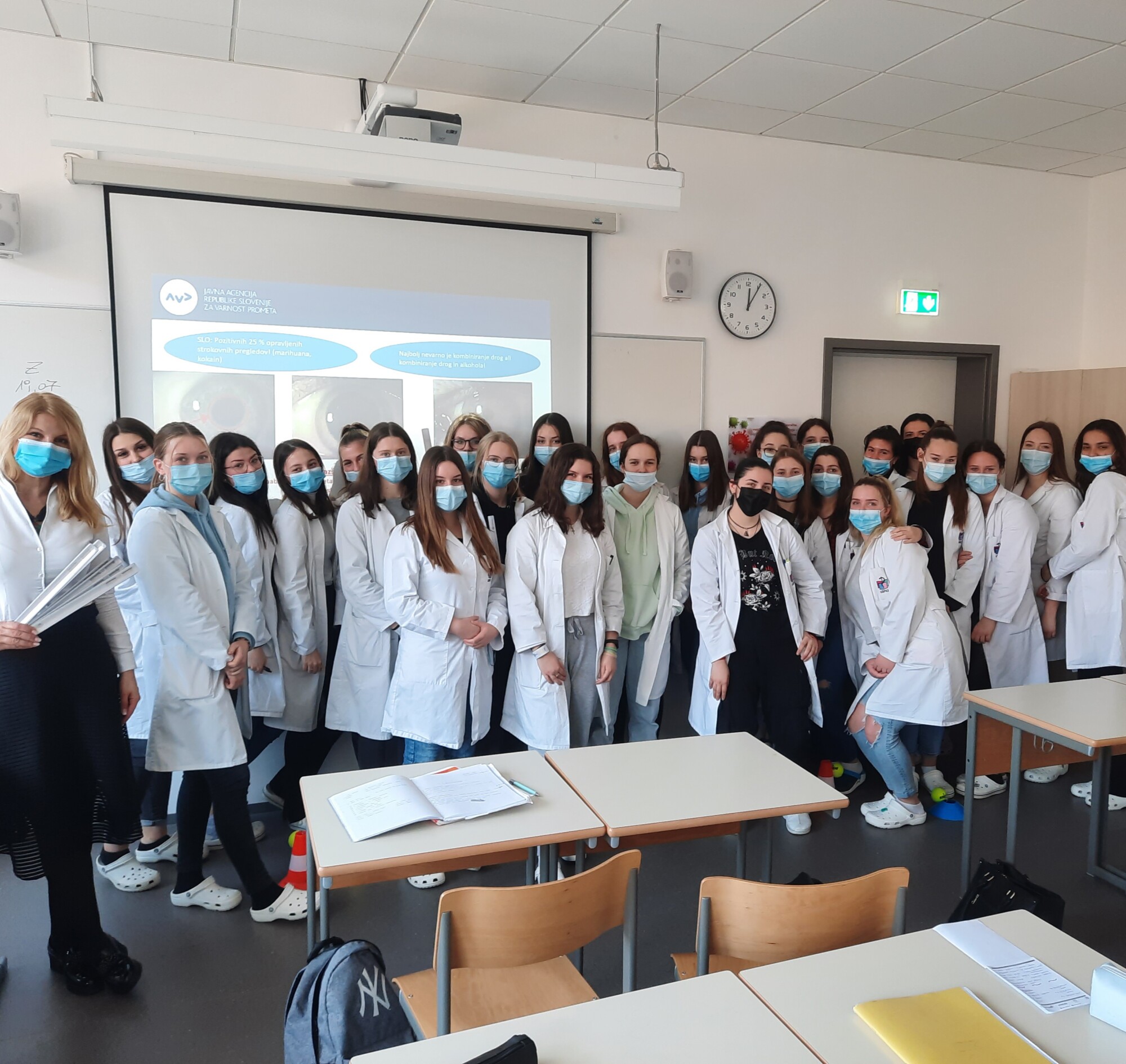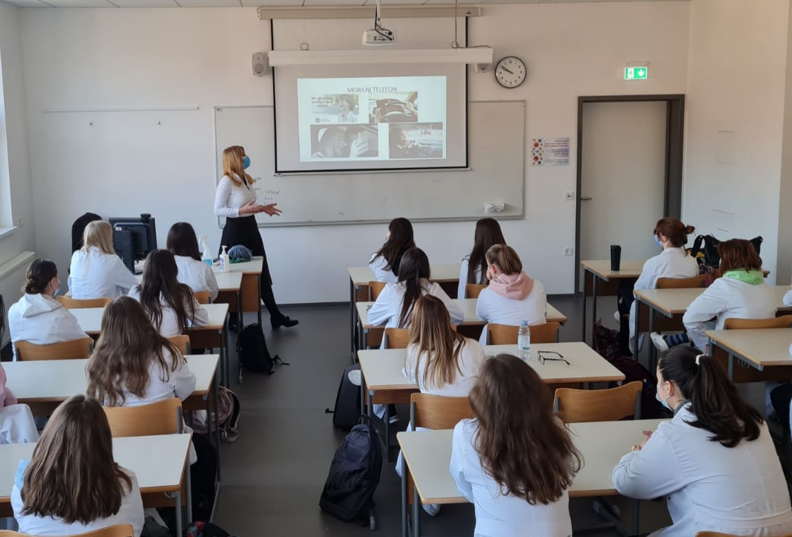 (Ljubljana, 4. marec 2022) Na Srednji šoli za farmacijo, kozmetiko in zdravstvo v Ljubljani so ves teden potekale delavnice za srednješolce Vozimo pametno. Dragica Sternad Pražnikar z Agencije za varnost prometa in Tomaž Tomaževic s Policijske uprave Ljubljana sta predavala več kot 200 dijakinjam in dijakom, ki so ob koncu delavnic prejeli tudi odsevne trakove, da bodo tako v prometu še bolj vidni in tudi varni. Posebno pozornost so posvetili vožnji z e-skiroji, saj jih uporablja vse več dijakov in imajo tudi izkušnje padcev ter k sreči doslej le lažjih poškodb. Z izvedbo delavnic Vozimo pametno bo Agencija za varnost prometa v marcu nadaljevala na Vegovi gimnaziji v Ljubljani.