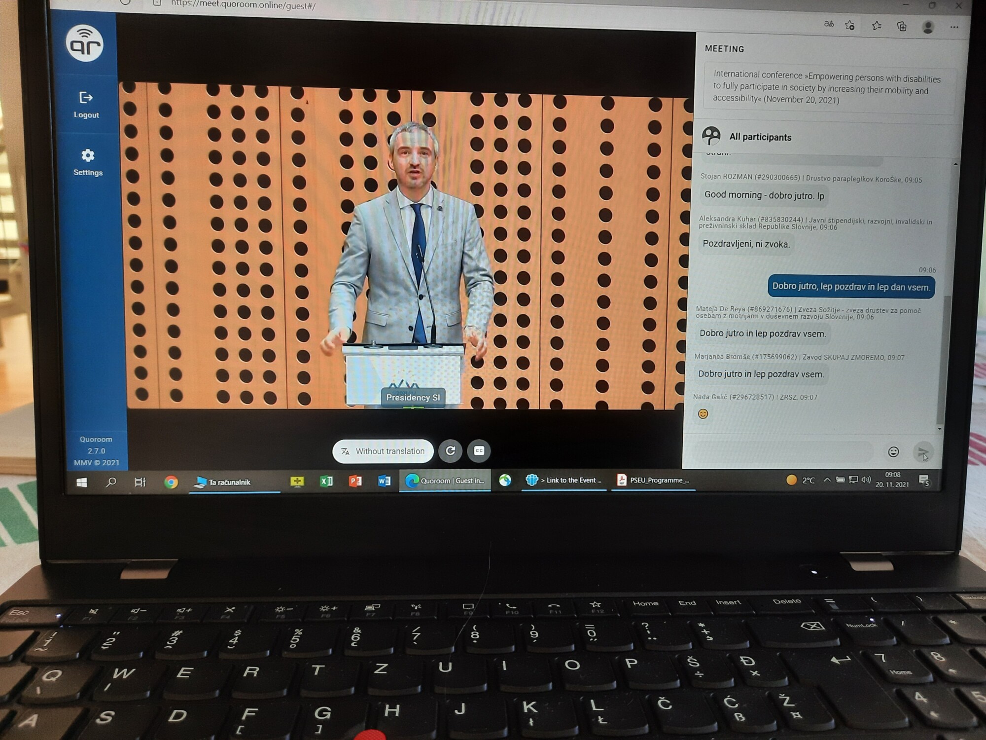 (Ljubljana, 20. november 2021) V soboto, 20. novembra 2021, je v okviru slovenskega predsedovanja Svetu EU potekala mednarodna konferenca z naslovom »Večja mobilnost in dostopnost sta pot k večji udeležbi in opolnomočenju invalidov v družbi«. Spletne konference sta se udeležili tudi Anamaria Hren in Dragica Sternad Pražnikar. Večja mobilnost invalidov je izredno pomembna za njihovo opolnomočenje.