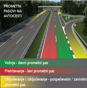 Na Agenciji želijo voznike spomniti, da pri vožnji na avtocesti ne velja prosta izbira prometnih pasov. Desni prometni pas je namenjen vožnji (vozni pas), levi prometni pas pa prehitevanju (prehitevalni pas). Prehitevanje po desnem prometnem pasu je prepovedano! Prav tako je prepovedana vožnja po levem prometnem pasu, ki je namenjen izključno prehitevanju.