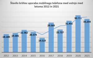 (Ljubljana, 7. januar 2022) Mobilni telefoni so zadnje desetletje eden izmed večjih motilcev pozornosti v prometu, ki dokazano povečujejo tveganje za nastanek prometnih nesreč. Vozniki ob uporabi mobilnih telefonov pogosto tudi povzročajo zastoje v prometu. Agencija za varnost prometa v času od 10. do 23. januarja 2022 koordinira preventivno akcijo »Varno brez telefona v prometu«. V letu 2021 je Policija ugotovila 33.254 kršitev glede uporabe mobilnega telefona med vožnjo, kar je 10 % manj kot v letu 2020. Upad kršitev je mogoče pripisati poostreni zakonodaji, ozaveščanju Agencije skozi vse leto in nadzoru Policije. Med kršitelji izstopa starostna skupina od 35 do 44 let, teh je bilo kar 31,6 %. Glede na kategorijo udeleženca prevladujejo vozniki osebnih avtomobilov, teh je bilo 16.664, oziroma dobra polovica, petina (7.053) pa voznikov tovornih vozil. Mobilni telefoni močno vplivajo na kognitivne sposobnosti voznika. Pisanje sporočil ali pregledovanje družbenih omrežij med vožnjo pomeni do 23-krat večje tveganje za nastanek prometne nesreče. V času akcije bo Policija nadzirala uporabo mobilnih telefonov in drugih naprav ter opreme (tablic, prenosnih računalnikov, slušalk), ki motijo voznikovo vidno in slušno zaznavanje ali možnost obvladovanja vozila. Poleg tega bodo pozorni tudi na druge prekrške, predvsem tiste, povezani z izpostavljenimi udeleženci v prometu, pešci, kolesarji. Agencija za varnost prometa in Policija pozivata: »Klic, sporočilo, všeček ali objava na družbenih omrežjih naj počakajo. Za volanom ne bodite za ekranom, v prometu ne bodite na spletu!«