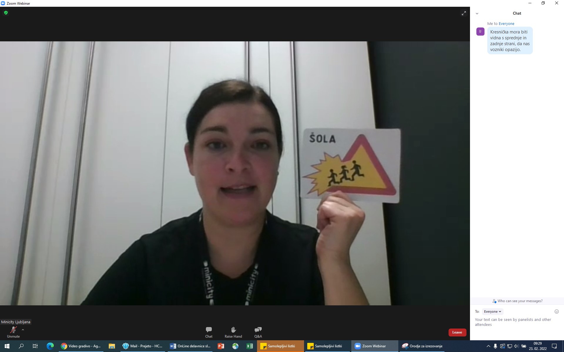 (Ljubljana, Maribor, Juršinci, 23. 2. 2022) Agencija za varnost prometa je v sodelovanju z Minicity danes začela izvajati spletne delavnice Bodi Pre(viden), ki potekajo v sklopu nacionalne preventivne akcije za večjo varnost pešcev. Na prvi delavnici je sodeloval eden od 4. razredov Osnovne šole Toneta Čufarja iz Maribora. Delavnice se danes nadaljujejo na Osnovni šoli Juršinci. V začetku marca je predvidenih še 12 delavnic na osnovnih šolah po Sloveniji, za osnovnošolce do vključno 5. razreda.